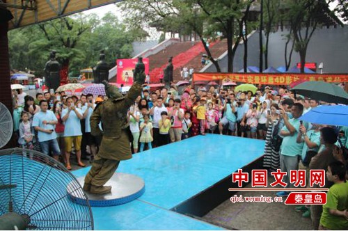 2016年7月7日,記者來到秦皇求仙入海處。在求仙殿廣場的東南方舞臺,伴著富有節(jié)奏感的音樂響起,“泡泡大叔”的街舞表演準時開始。他穿著皮質(zhì)的兵馬俑服裝,蹬著黑色軍靴,臉上涂滿灰色油彩。只見他雙腳不動,雙手舞動前伸,身體前傾與地面成45度。固定幾十秒后,身體慢慢復(fù)位站直,又隨著音樂跳起了街舞。大約半個小時后,汗如雨下的“泡泡大叔”沖到電扇前吹風(fēng),一口氣喝下2瓶藿香正氣水,又跑回舞臺繼續(xù)表演。